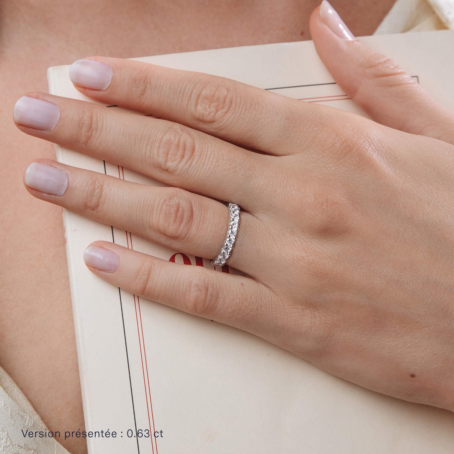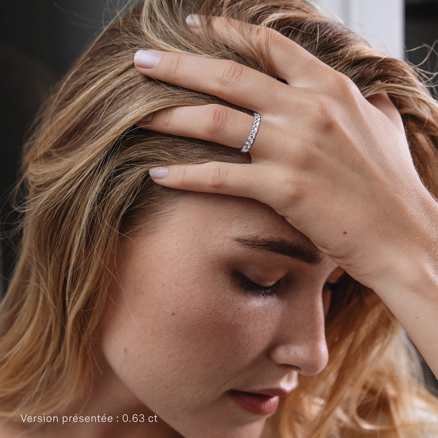 Alliance sur-mesure, la déclinaison de ses poids de diamants permet de choisir le volume, le budget et la largeur souhaités, pour s'adapter à toutes les envies et les combinaisons, qu'elle soit portée en accumulation, seule ou associée à un solitaire.