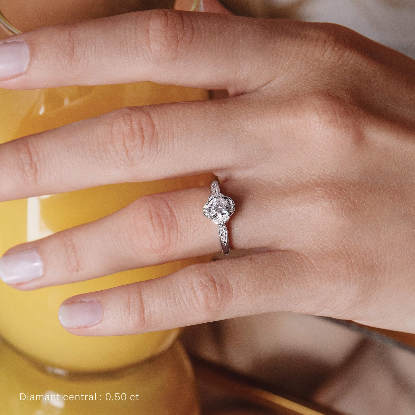 De part et d'autre, 4 petits diamants ronds sertis sur l'anneau comme les feuilles de notre fleur.