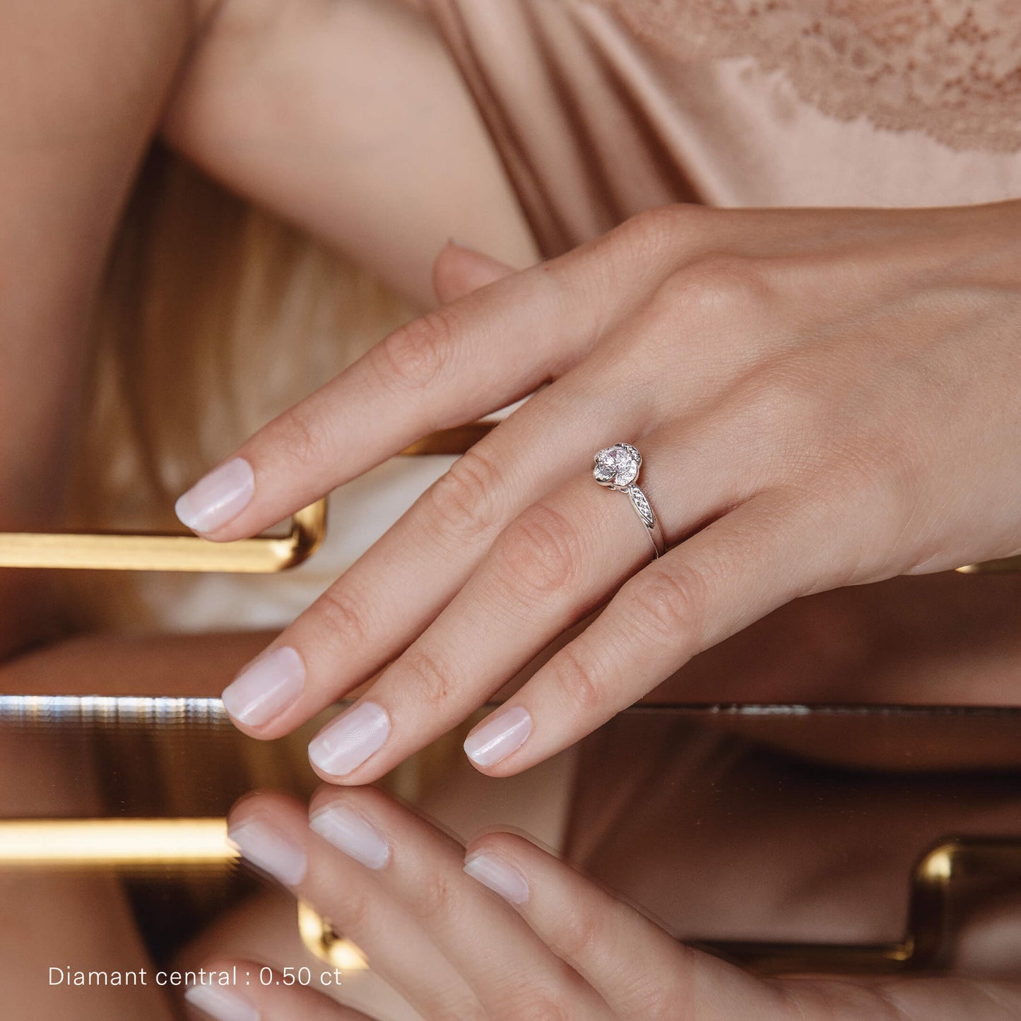 De part et d'autre, 4 petits diamants ronds sertis sur l'anneau comme les feuilles de notre fleur.