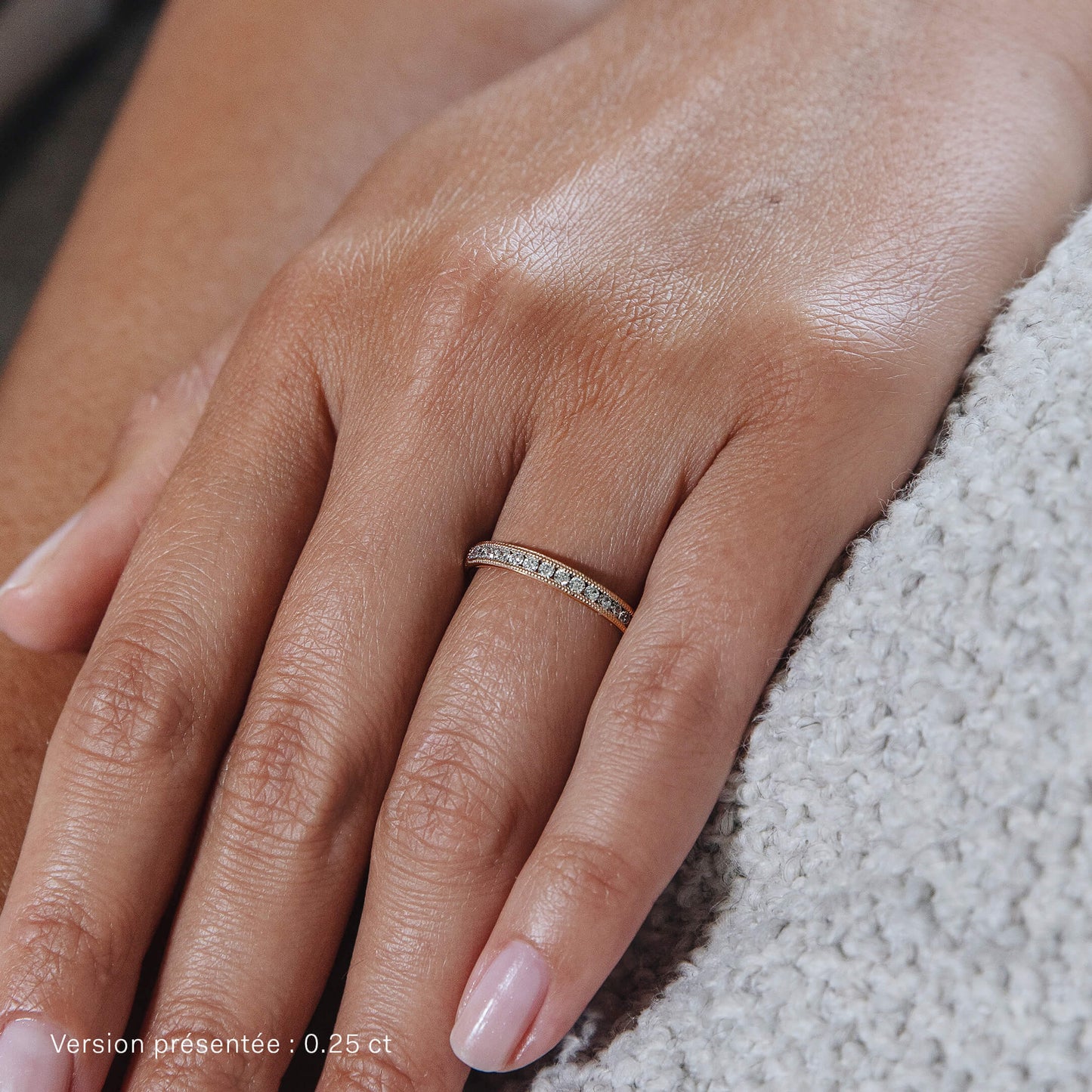 Alliance douce et poétique en or rose délicatement perlée sur ses contours et disponible dans des poids de diamants de 0.25 carats à 1 carat.