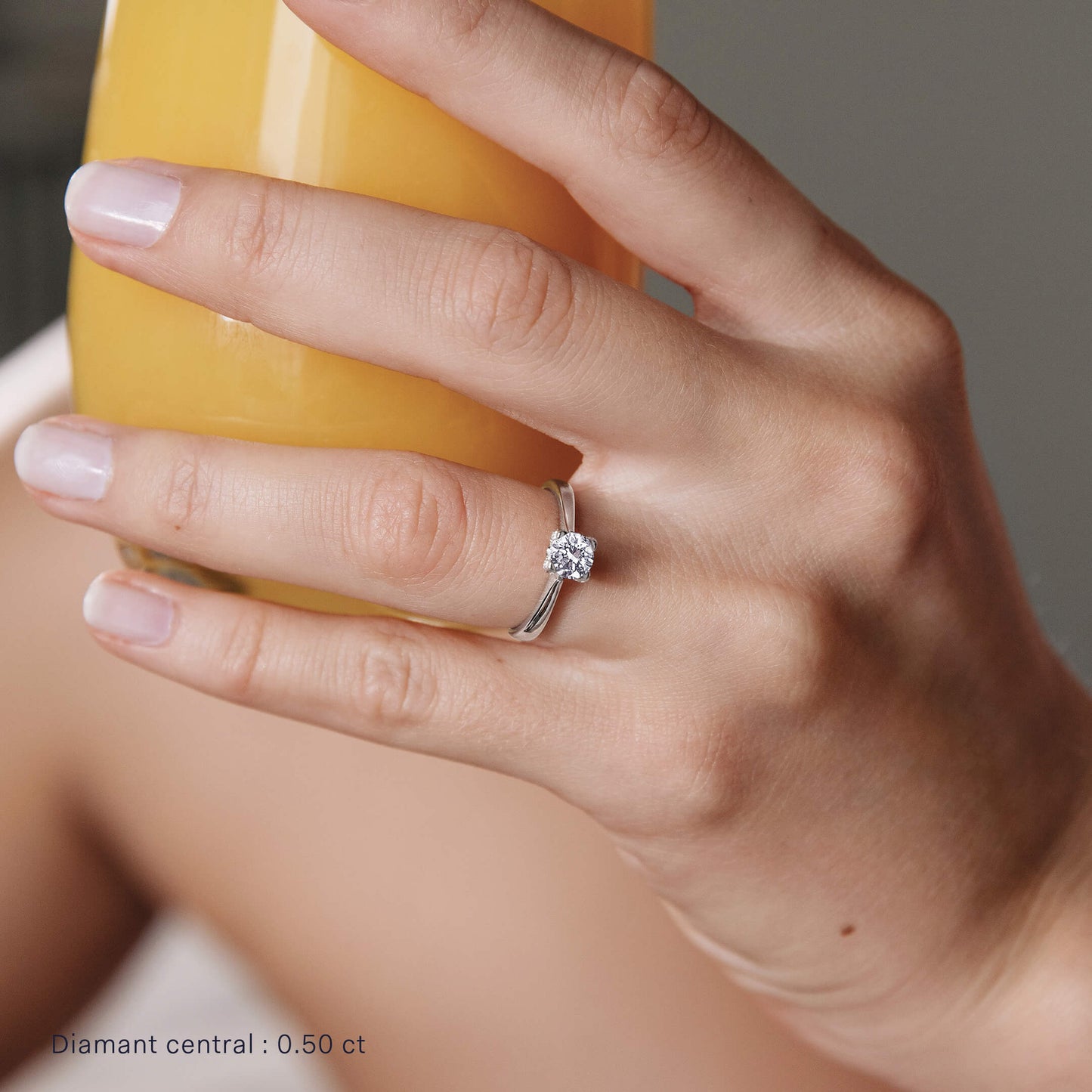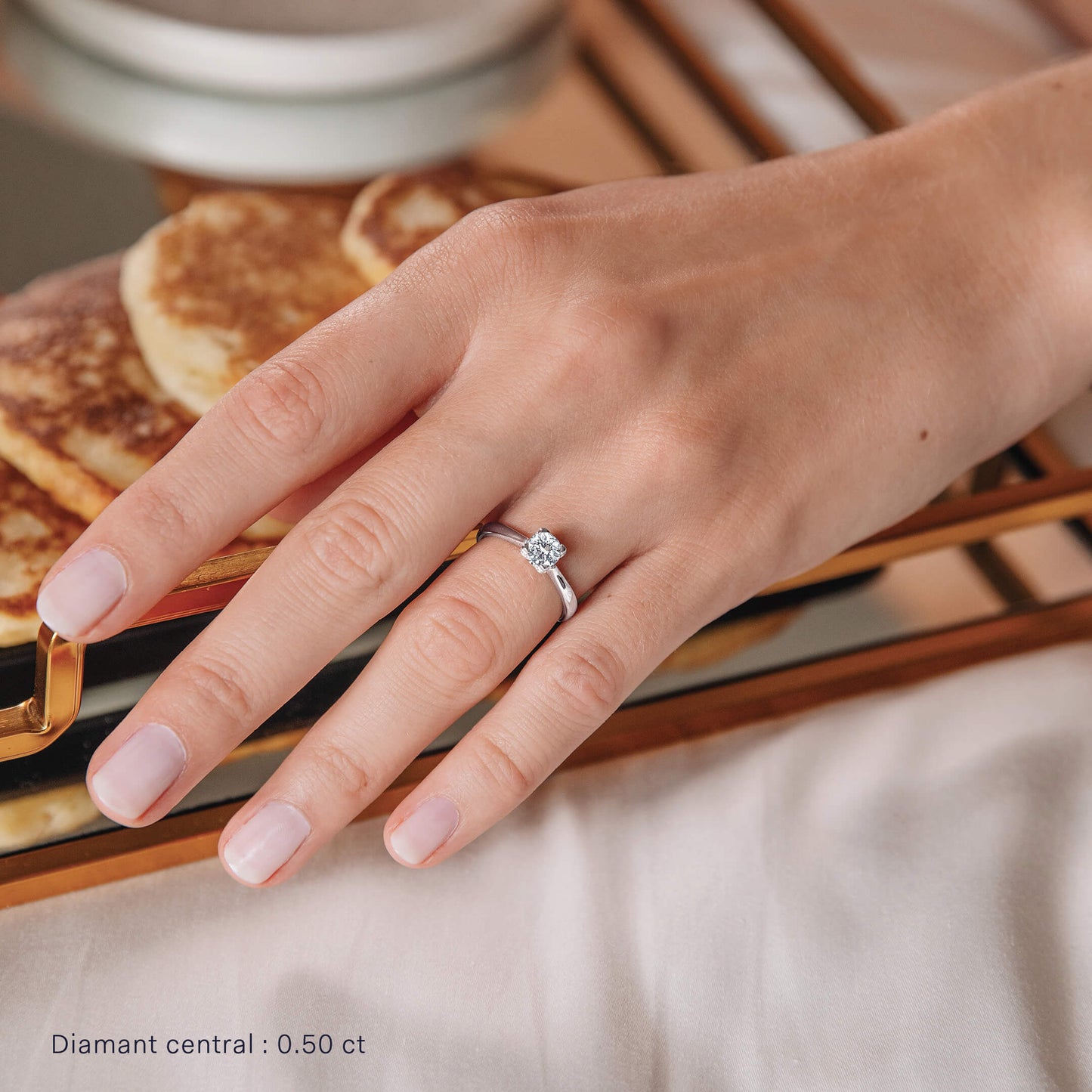 Son anneau fin permet une parfaite mise en valeur du diamant central, de qualité G/SI1, pour lui offrir un maximum de brillance. Pour s'adapter à toutes les envies, cette création est disponible avec un diamant rond brillant de 0.30ct ou de 0.50ct, toujours accompagné d'un certificat GIA pour attester des critères de qualité et de pureté du diamant.