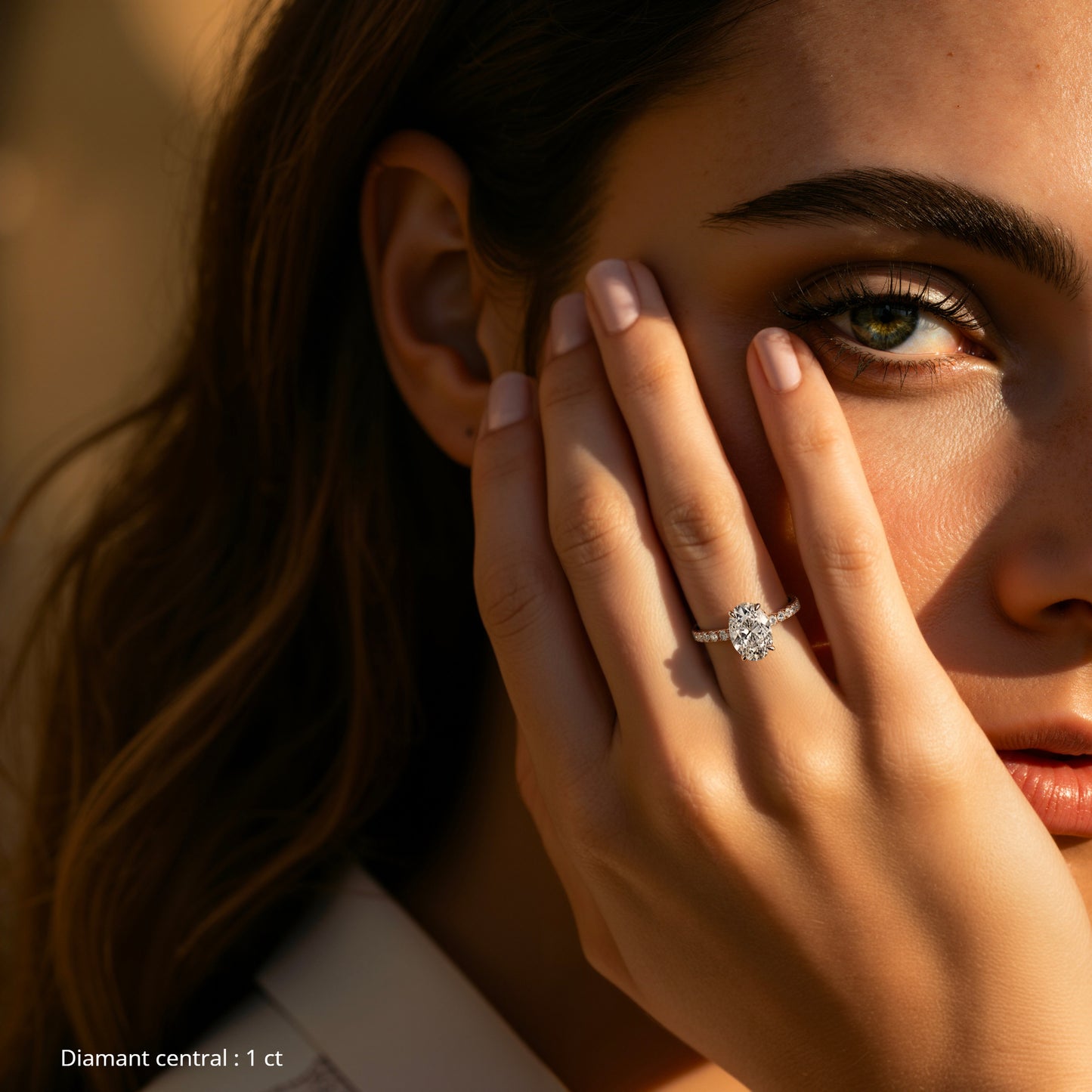 Cette création empreinte de douceur, offre sa petite subtilité: un éclat imprévu apparaît, grâce aux diamants fins présents sur la ceinture sous la pierre centrale. Tout en délicatesse, le modèle est ainsi sublimé. L’allure géométrique du corps de bague est contrebalancée par la douceur de sa pierre ovale de couleur F et pureté VS2, qui surplombe cet ensemble et capte la lumière pour une brillance absolue.