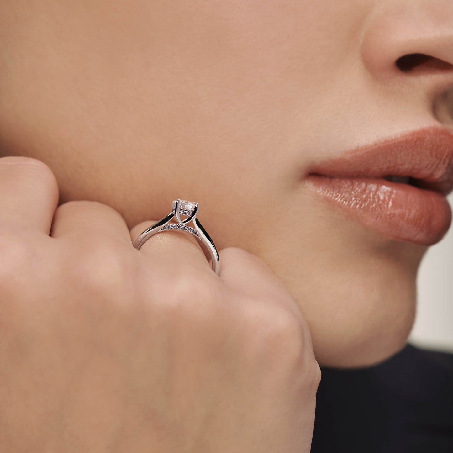 Le sertissage via 4 griffes dites "bec d’aigle", rabattues et affinées sur le diamant, lui apporte un caractère affirmé et résolument moderne. Elles permettent de maintenir fermement le diamant central de qualité G/SI1, sublimé par une monture sertie de diamants sur les ¾ de sa circonférence. Cette conception sophistiquée a été minutieusement pensée pour rehausser et mettre en valeur le diamant central, créant ainsi une brillance et une élégance incomparables.