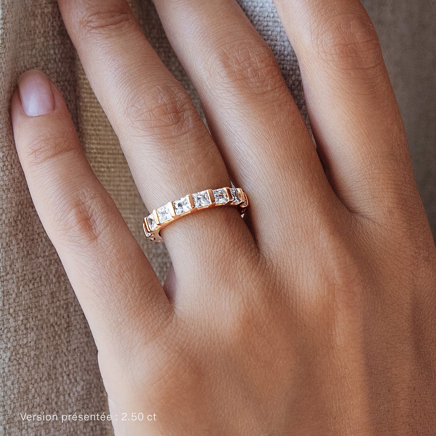 Ses diamants princesse apportent modernité et éclat intense, chacun d'entre eux est parfaitement épousé.