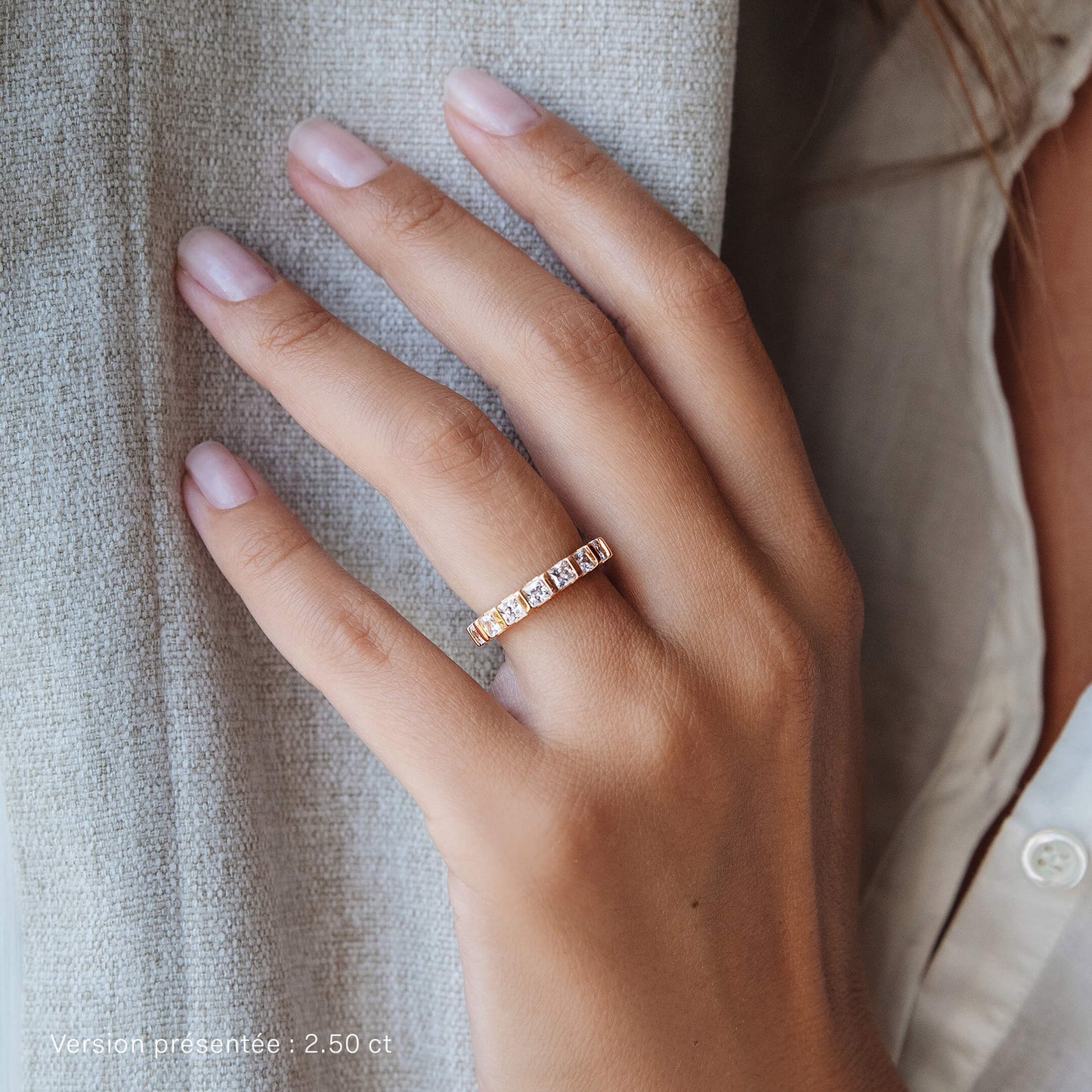 Contemporaine, Safia est une alliance en or jaune dont le serti protecteur renferme des diamants carrés sur l'entièreté de sa monture.