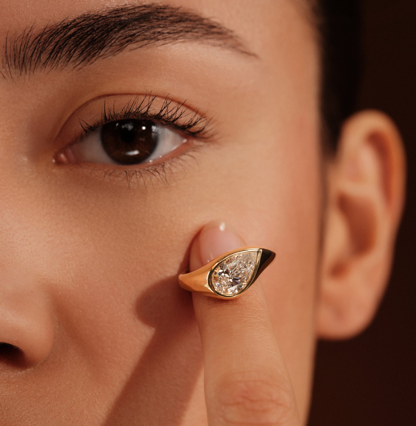 La bague Shiloh Lab en or jaune met en lumière un diamant de synthèse poire de 1,70 carat dans un serti demi-clos sculptural. La pierre semble se fondre dans la monture, créant un effet fluide et contemporain, tout en préservant une belle ouverture de lumière.