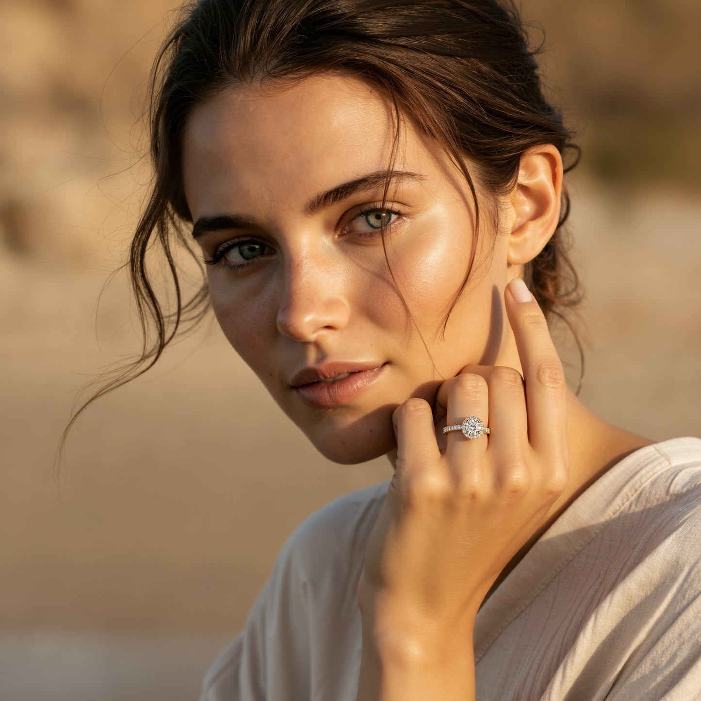 Soulignant avec modernité la pureté du diamant central de qualité G-SI1, le halo de diamants offre l’illusion d’une pierre de poids supérieur, l’habillant d’une touche de vintage. Sa fine monture légèrement en contrebas du chaton est elle aussi pavée de diamants, délivrant un ensemble d’éclats impressionnant.