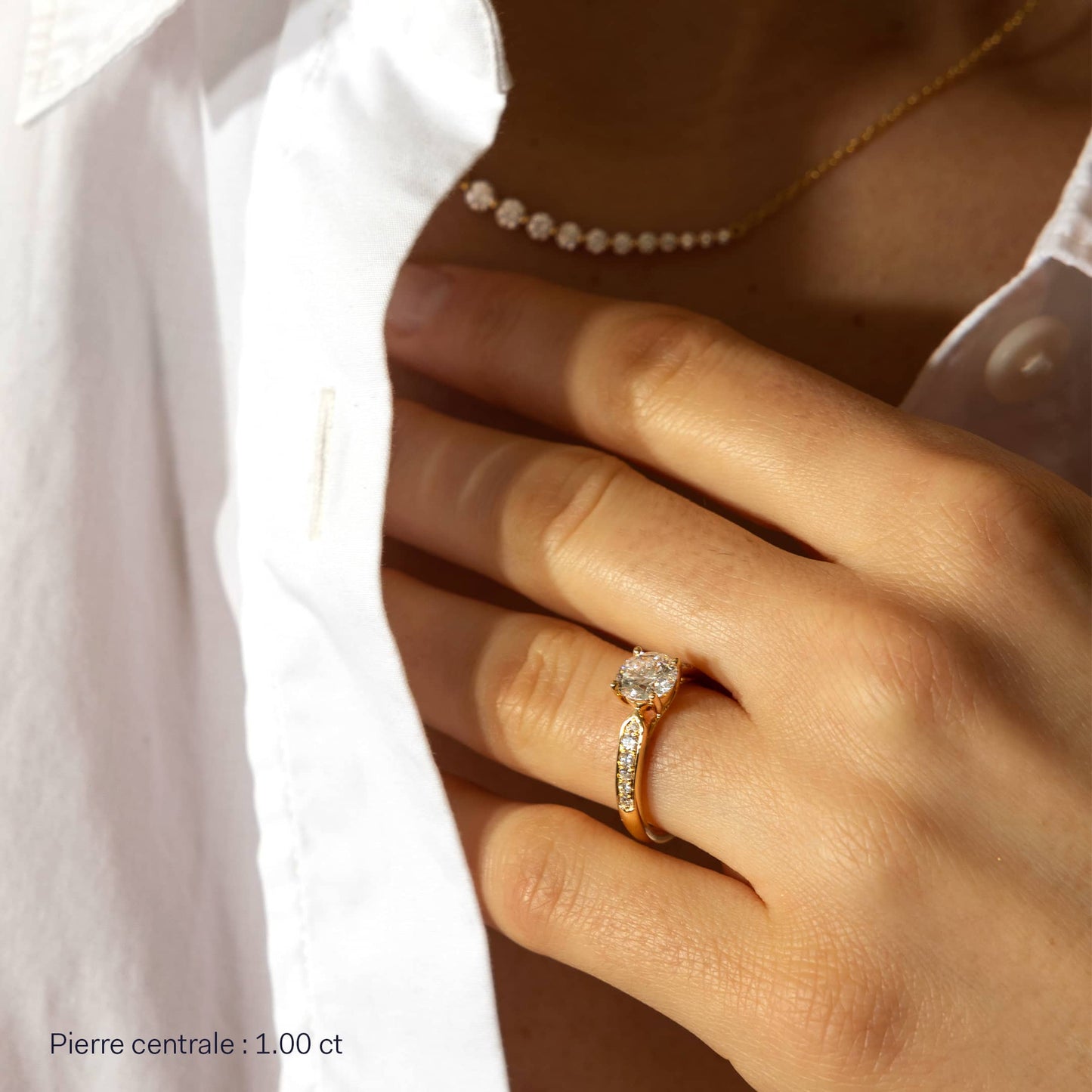 Exaltée par la brillance des pierres qui la sertisse, Ofé est une sublime bague de fiançailles accompagnée en platine 950/1000ème 750/1000ème et au diamant de synthèse central de 0.50ct, 0.70ct ou 1.00ct sertis sur 4 griffes.